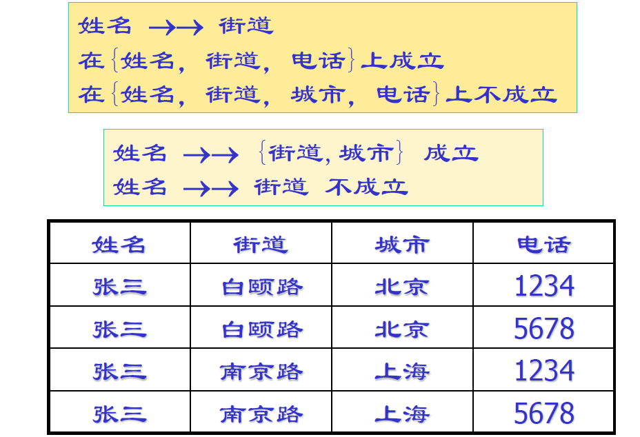 - 则称 \(Y\) 多值依赖 \(X\),记作 \(X\to\to Y\)