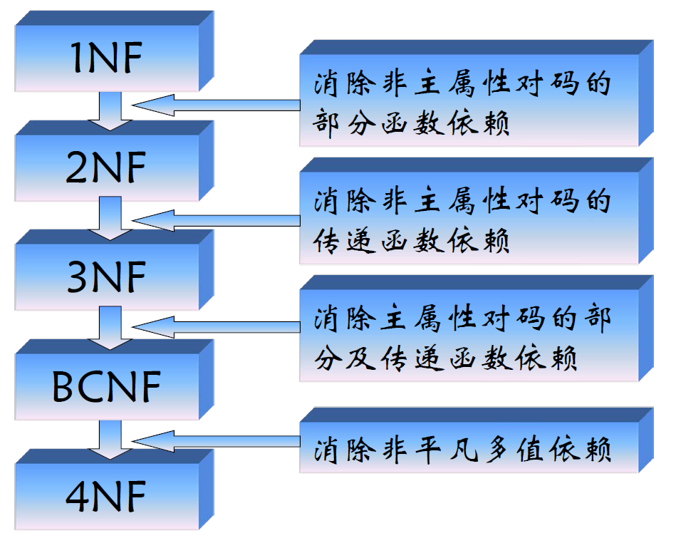 - 关系模式 \(R(U)\in 1NF\) ,对于非平凡的多值依赖 \(X\to\to Y(Y\not\subseteq X)\),X 含有码,则称 \(R\in 4NF\)